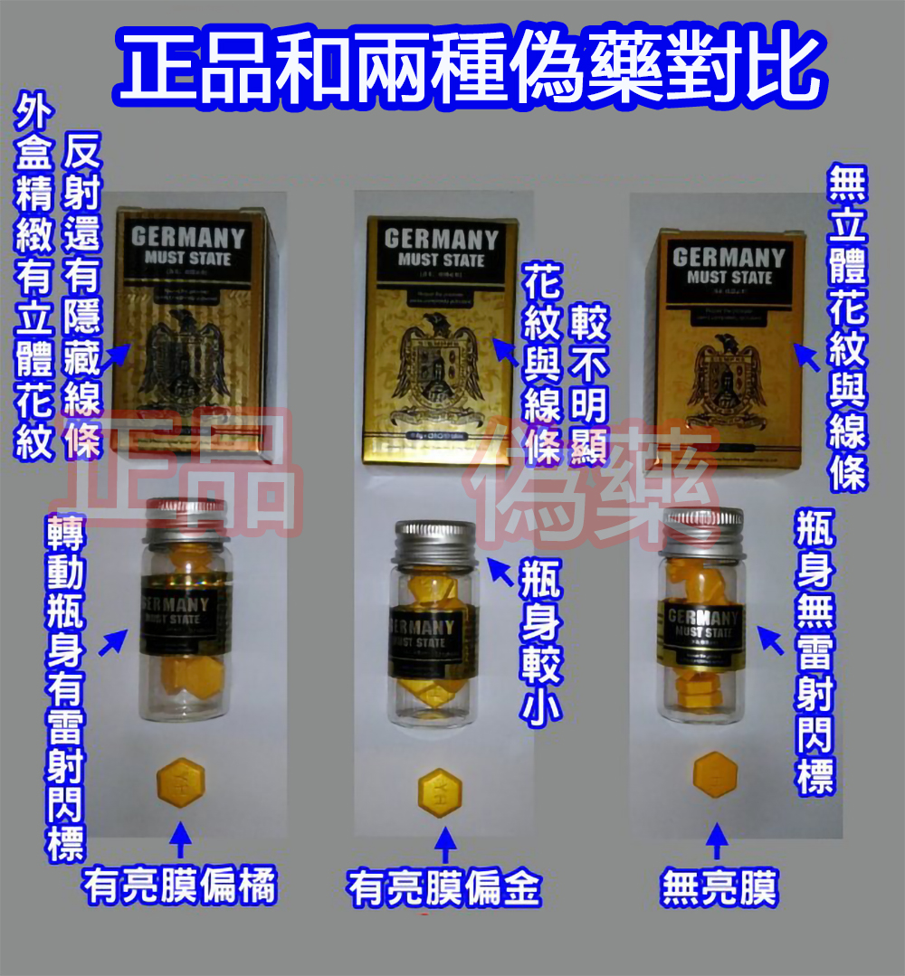 | 藥丸顏色 | 鮮豔純黃色,燈光下無色差 | 暗黃或偏橘,有斑點 |